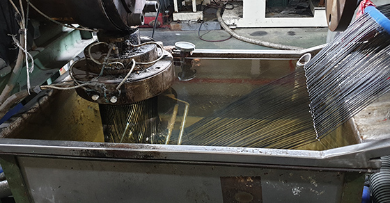 방사된 실(yarn)를 냉각수로 응고하여 연신을 위한 준비단계