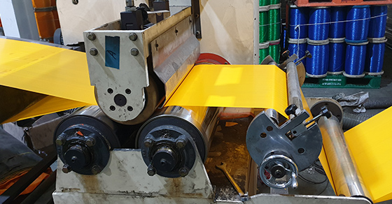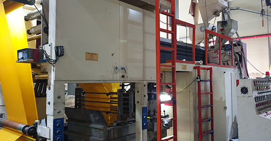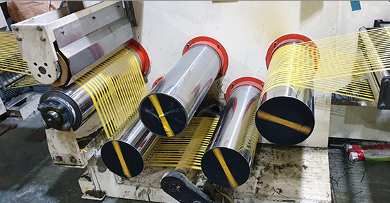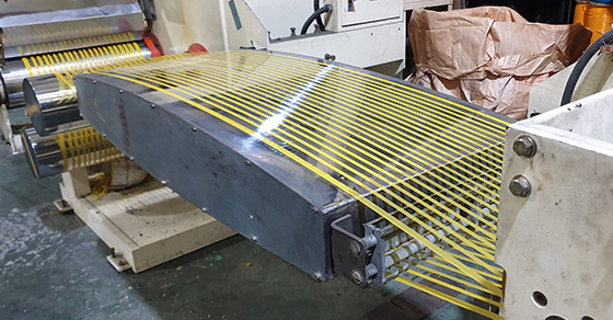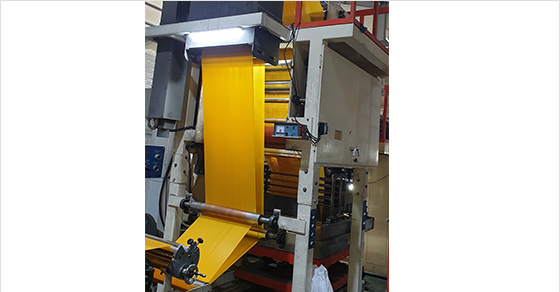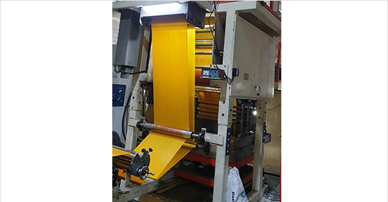 혼합된 원료(Resin)를 물성기준에 따라 용융시켜 T-다이스를 통해 필름 형태로 출력