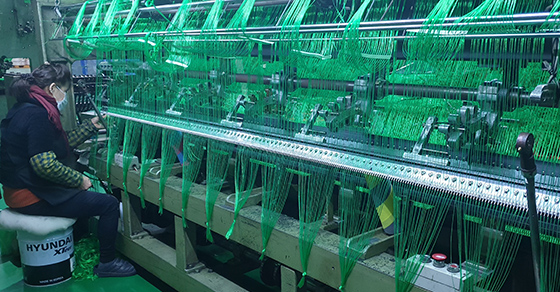 소정 올수의 경사를 길이 및 장력을 균일하게 일정한 너비가 되도록 배열하여 빔에 감는 작업공정